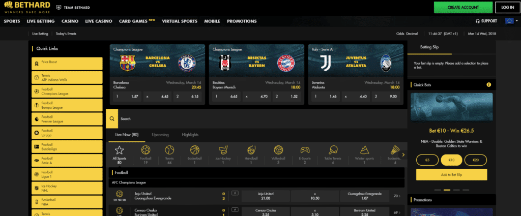 Det kommer säkert inte som någon överraskning att Bethard erbjuder bra odds och betting. När man har Zlatan som samarbetspartner, då är det nog obligatoriskt att erbjuda kvalitativa sportspel som vi kan tal del av. Satsa på fotboll inom många olika ligor och serier, ishockey, tennis, eller vad som helst, det finns flera tusentals olika alternativ att välja mellan. Du kan även spela samtidigt som en match pågår, detta genom casinots sektion för live odds.