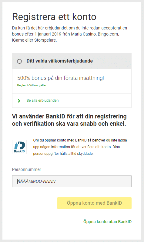 Hos Unibet så kan du använda BankID för att registrera dig, vilket gör att det går väldigt snabbt och enkelt.